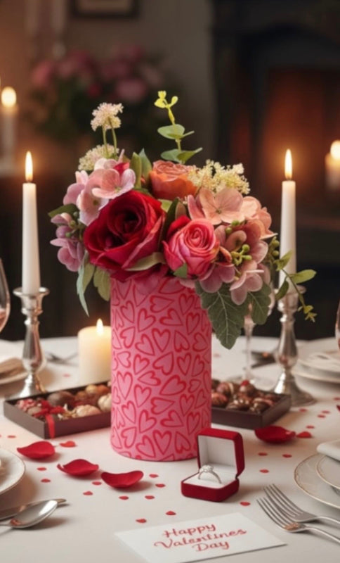 Farbe: pinker Hintergrund, rote Herzen