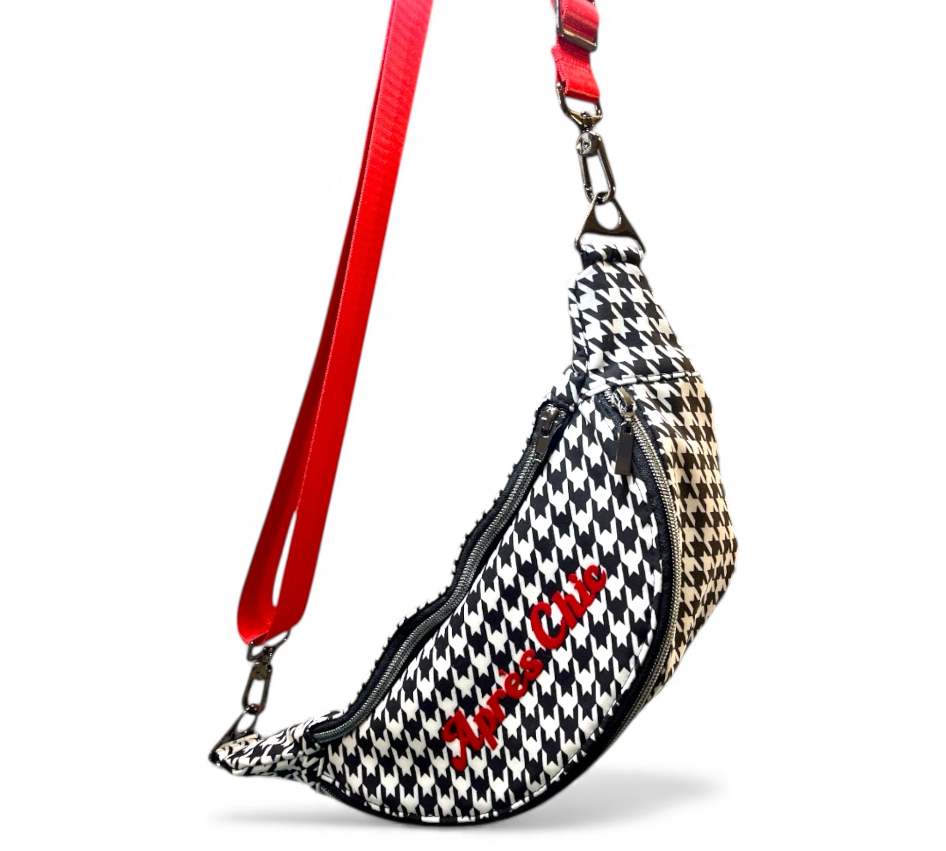 Der markante Schwarz-Weiß-Hahnentritt kombiniert mit dem roten Flockschriftzug Après Chic macht die Tasche zu einem modischen Statement für alle, die Stil und Praktikabilität verbinden möchten.